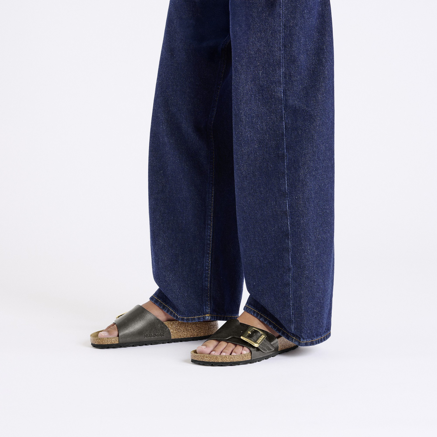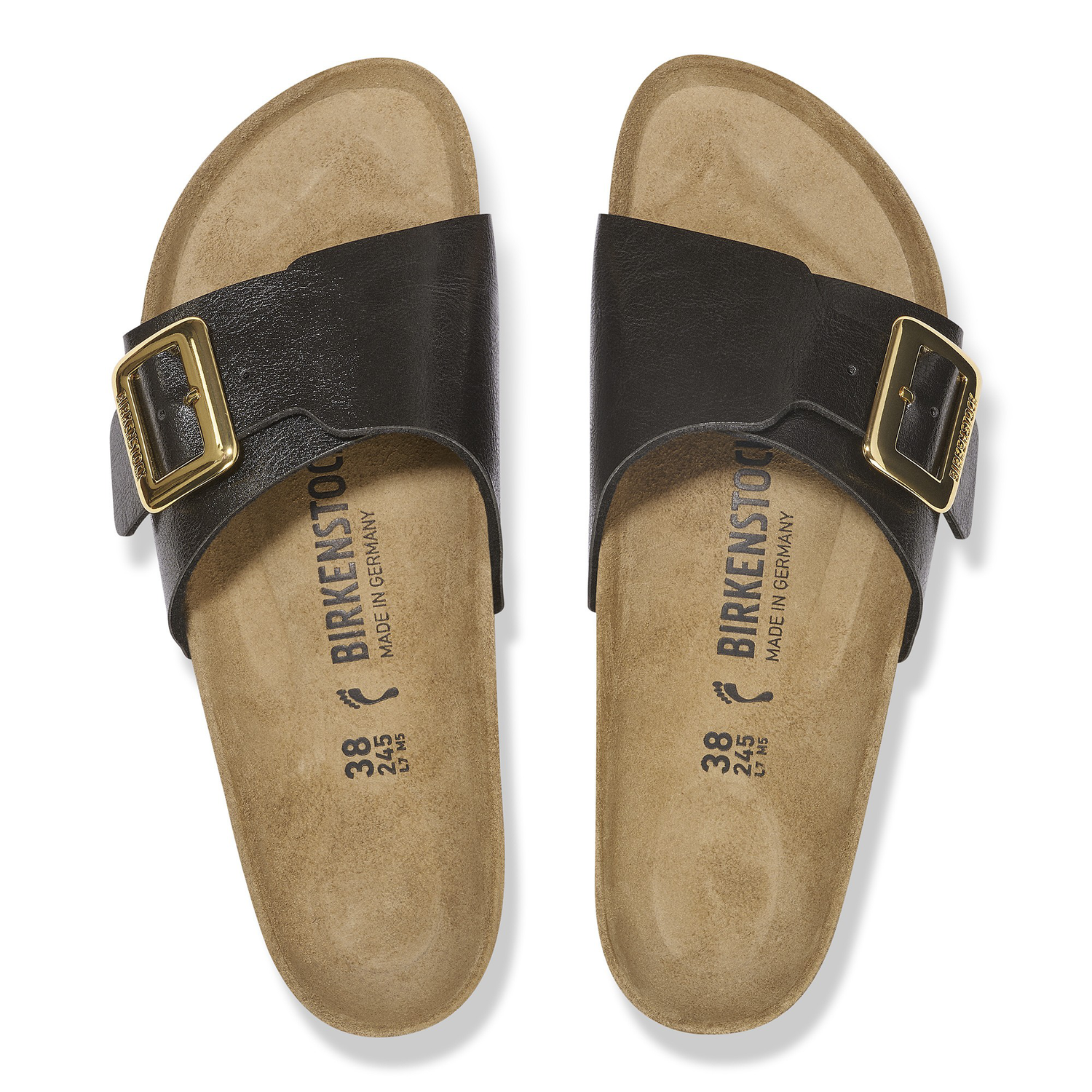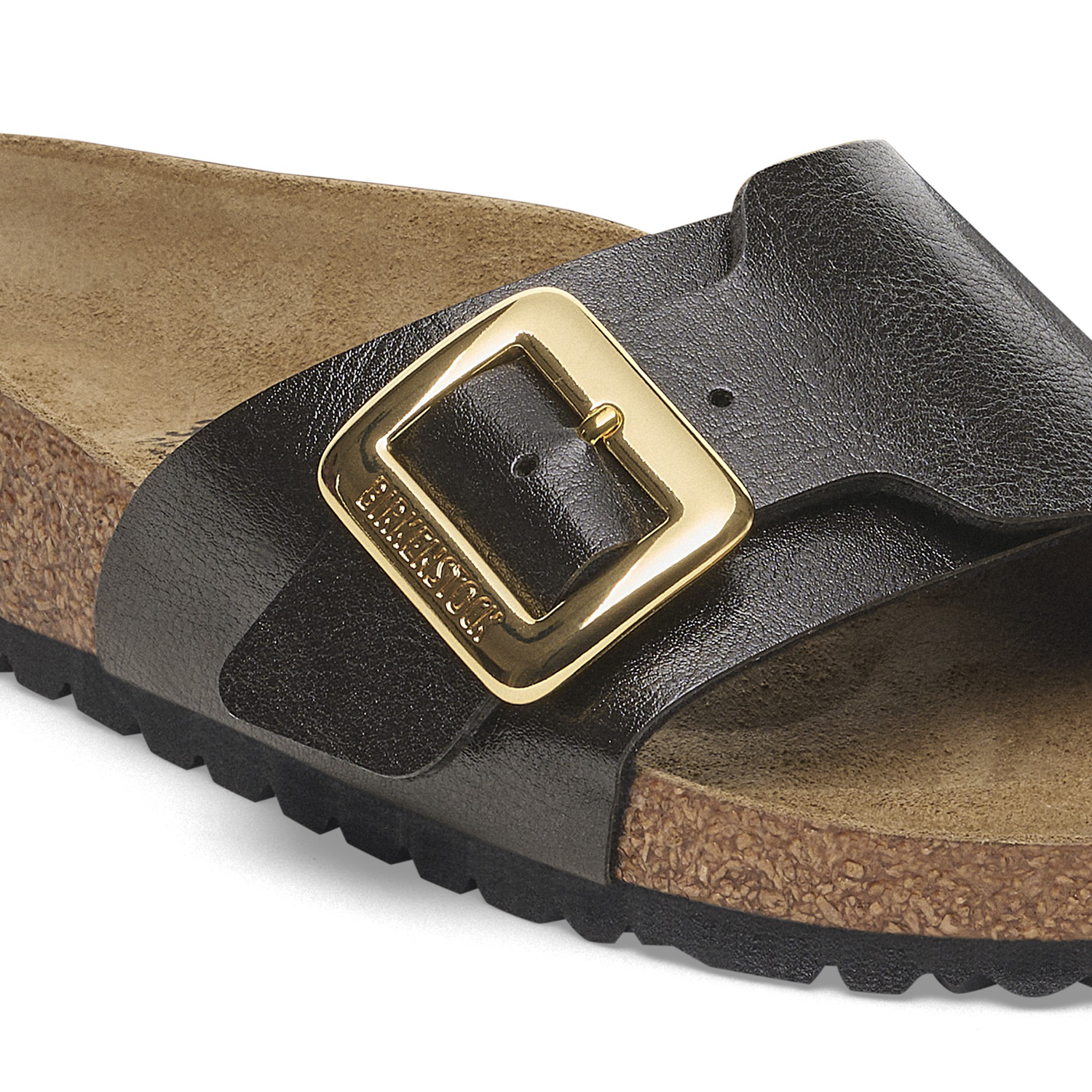 The design of the BIRKENSTOCK Catalina was inspired by the classic Madrid with a strap and metal buckle. The slightly wider strap lends this sandal a modern and elegant appearance. This sandal version has a silky sheen finish. The shiny, gently rounded padded buckles are especially eye-catching. The upper is made from the skin-friendly, hard-wearing synthetic material Birko-Flor®.